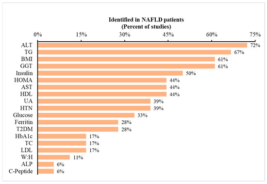 Occurrence of metabolic variables reported in prior studies of NAFLD patients. Legend: The dataset consists of 17 studies. The data depict the percentage of studies reporting specific metabolic variables listed on the x-axis. To illustrate, 72% of previous studies indicated ALT as a metabolic marker for predicting NAFLD. Abbreviations: ALT: alanine aminotransferase; BMI: body mass index; AST: aspartate aminotransferase; UA: uric acid; T2DM: type 2 diabetes mellitus; TC: total cholesterol; and W:H: waist-to-hip ratio.
