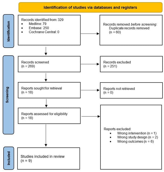 A total of 329 publications were achieved following a computer-assisted search (Figure 1). Following the removal of duplicate publications, 269 articles underwent screening by title and abstract to assess eligibility, resulting in 251 articles being excluded. The remaining 18 articles progressed to full-text analysis. During this process, 1 article was excluded due to wrong intervention, 2 articles were removed due to wrong study design and 6 articles were removed due to wrong outcomes.