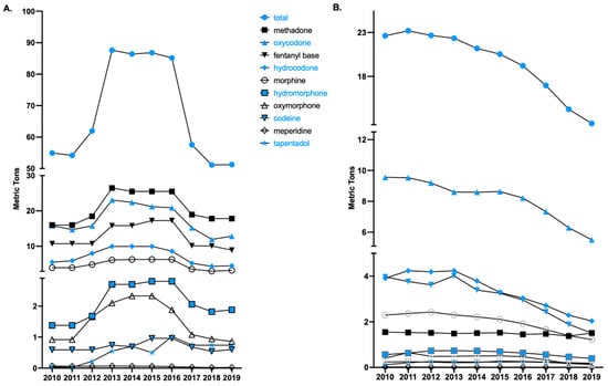 An examination of total opioid production quota data from 2010 (54.9 MME metric tons) to 2019 revealed a gradual increase from 2011 to 2012, followed by a steep increase from 2012 to 2013 (87.6 tons), which remained relatively steady until a pronounced decline from 2016 (85.2 tons) to 2017 (57.6 tons). There was a 39.8% reduction from 2016 to 2019 (51.3 tons). Meperidine (−60.0%), oxymorphone (−54.3%), morphine (−49.6%), fentanyl (−48.5%) and hydrocodone (−48.1%), exhibited pronounced declines. Oxycodone (−38.5%), codeine (−37.5%), hydromorphone (−32.9%), methadone (−30.1%), and tapentadol (−27.5%) had sizable but more modest reductions in opioid production quotas (Figure 1A).