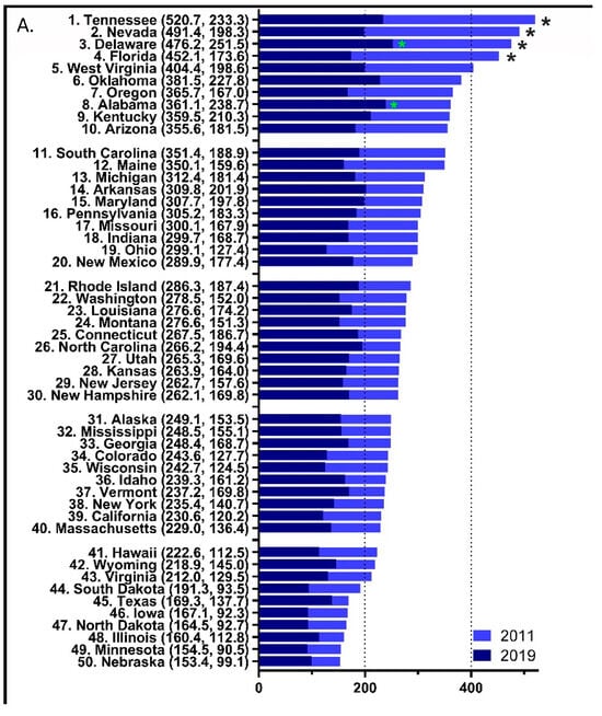 Comparison of total opioid distribution per capita in 2011 and 2019 revealed an overall decrease (−51.96%), but also considerable state-level differences, illustrated in Figure 2A and Figure 3.