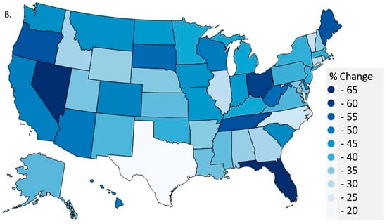 In 2011, four states, Tennessee (520.70), Nevada (491.38), Delaware (476.15), and Florida (452.12), had significantly elevated levels of total opioid distribution relative to the national mean (284.34, p < 0.05, Figure 2A). However, only two states, Alabama (251.45) and Delaware (238.71), were significantly above the national average (162.09) in 2019. Forty-three states had an MME per capita > 200 in 2011 relative to only six in 2019 (χ2(1) = 54.78, p < 0.0001). Four of these six states were in the southeastern (KT, TN) or south-central (AL, OK) US. Furthermore, there was a 3.31-fold difference between the highest (Florida = −61.61%) and lowest (Texas = −18.64%) states for the decline in opioid distribution. Figure 2B demonstrates the observed percent difference for total opioid distribution during this period and shows that other states with >50% reductions were Nevada (−59.7%), Ohio (−57.4%), Tennessee (−55.2%), Maine (−54.4%), Oregon (−54.3%), and West Virginia (−50.9%).