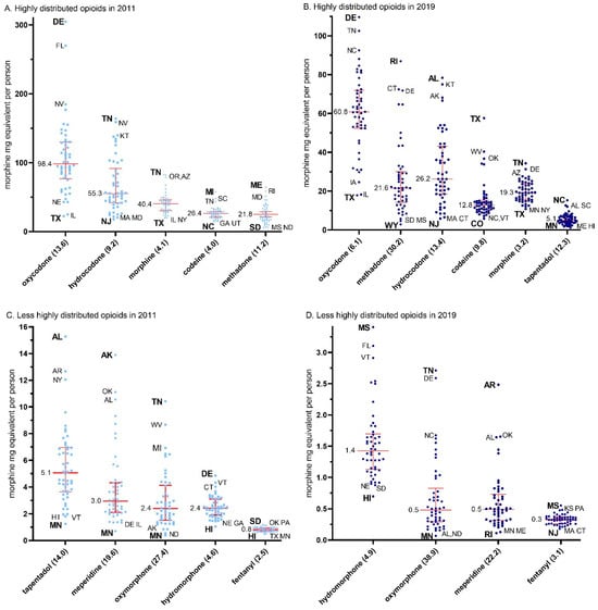 Median (+/− interquartile range) per person distribution as reported to the US Drug Enforcement Administration’s Automated Reports and Consolidated Orders System for highly (A,B) and less highly (C,D) distribution prescription opioids by morphine mg equivalents per state in 2011 (A,C) and 2019 (B,D). The maximum to minimum ratio is listed in parentheses after each opioid. The median is written next to each (red) solid horizontal line. Abbreviations are shown for states outside of the 95% confidence interval, with the highest and lowest states in bold.