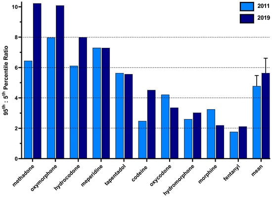 Figure 4 shows the ratios between the 95th:5th percentiles for the population-corrected distribution of each Schedule II opioid for 2011 and 2019. The 2011 ratio was highest for oxymorphone (8.0) and meperidine (7.3) and smallest for codeine (2.4) and fentanyl (1.8). The 2019 ratio was highest for methadone (10.2) and oxymorphone (10.1) and lowest for morphine (2.21) and fentanyl (2.11) in 2019. A comparison of the ratios between 2011 (4.78 ± 0.70) and 2019 (5.64 ± 0.98) revealed a nonsignificant difference.