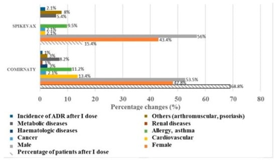 The incidence of moderate immune-allergic reactions was approximately double in the sample treated with Spikevax® vs. the sample treated with Comirnaty®, and affected the female sex (Figure 2). In detail, in adult patients, vaccination administration caused mild and moderate injection site reactions in all patients with expected tolerance, and in some patients adverse reactions that did not require hospitalization or medical intervention occurred within 24–48 h and were reported in the data sheet.