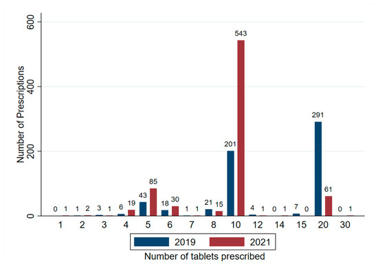 A total of 1357 prescriptions for oral oxycodone IR were written over the study period, two records were removed where the prescribed quantity of oxycodone IR was 0. There was an increase in the number of prescriptions observed from 2019 (n = 596) to 2021 (n = 761). However, when controlled for differential rates of patient presentations between the two study periods, there was no significant difference in the rate of oxycodone IR prescriptions supplied. In total, 596 prescriptions were written in 2019 at a rate of 188.95 per 10,000 presentations, and n = 761 prescriptions were written in 2021, a rate of 203.73 per 10,000 presentations. Incident Rate Ratio 0.927 (0.831–1.033) p = 0.168. Prescriptions were written by emergency physicians, nurse practitioners and inpatient medical or surgical specialty teams. The number of prescriptions containing 20 oxycodone IR tablets fell from 48.8% (n = 291) of prescriptions in 2019 to 8.0% (n = 61) in 2021, prescriptions for 10 oxycodone IR tablets increased from 33.7% (201) of prescriptions in 2019 to 71.3% (543) in 2020 (Figure 1).