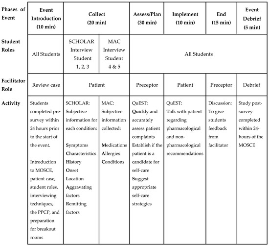 As a result of the COVID-19 pandemic, the pharmacy curriculum saw major changes relating to education infrastructure and delivery [6]. The abrupt shift to an online format necessitated the imminent and urgent development of a virtual OSCE [7,8]. At the University of Southern California (USC) Alfred E. Mann School of Pharmacy and Pharmaceutical Sciences, the Medical and Pharmacy Student Collaboration (MAPSC), a student-led organization, marshaled the development and implementation of a novel extracurricular, peer-led, virtual group Mock OSCE (MOSCE). This feat was aimed at filling a gap in hands-on clinical experiences left by the pandemic. The MOSCE format was used to simulate clinical experiences and familiarize first-year pharmacy students (P1s) with the PPCP. At this stage in the USC curriculum, students have received some exposure to the PPCP.