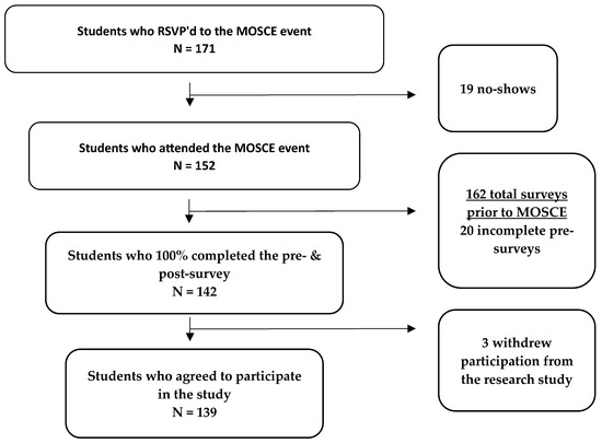 To be included in the study, each P1 student had to complete the pre- and post-surveys within 24 h before and after participation in the MOSCE. The surveys were administered to students individually through Qualtrics. The data were directly exported to Microsoft Excel, and any identifiable information, such as emails, was promptly deleted by the investigators. The primary outcomes were changes in self-reported confidence in (1) applying the PPCP and (2) patient communication, medication knowledge, and clinical skills. The statistical analysis was a paired two-tailed t-test with a significance level of p < 0.05. Outliers were removed from the sample population by grouping together scores for all PPCP components and learning outcomes, using the interquartile range method to normalize the data. A subgroup analysis evaluated differences in baseline characteristic questions in (1) gender groups, (2) age groups, (3) previous experience, and (4) those who’ve previously attended a MOSCE versus those who had not (see Appendix A). The statistical analysis for subgroups was a t-test with unequal variance. Inclusion criteria were P1s who attended the MOSCE, achieved 100% completion status for both surveys, and consented to participate in the study (see Figure 2). Participation in the MOSCE and survey was voluntary, but attendees were awarded 1% extra credit to their PHRD 516 course grade from the course coordinator.