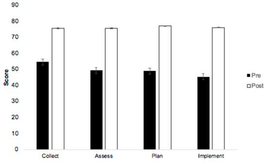 The change in self-reported confidence was significant for all PPCP components (p < 0.0001; see Table 2). The highest pre-scores were found in the collect and assess phases compared to later PPCP components. The greatest mean change in self-reported confidence was found in the plan and implement sections, which had the lowest pre-scores of 49 and 45, but had the greatest mean change of 28 and 31, respectively (see Figure 3). The removal of the outliers did not change the outcomes of any statistical analysis.