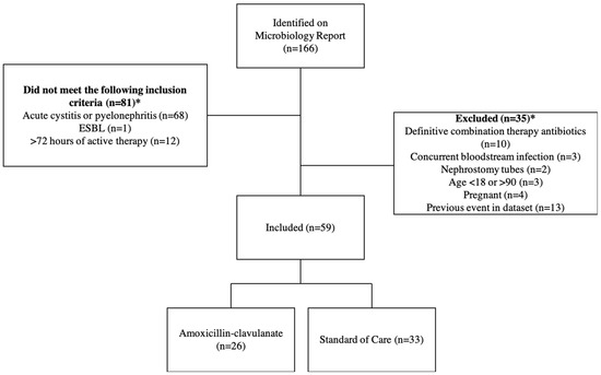 One-hundred and sixty-six patients were identified on the microbiology report, and 59 met study inclusion (Figure 1). The majority of patients were excluded due to the positive urine culture not representing acute cystitis or pyelonephritis as defined above or due to lead-in therapy lasting more than 72 h.