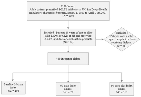 A total of 174 patients with 489 insurance claims were included in the analysis. One hundred and six claims were within the first 30 days, 73 in 60 days, and 310 in 90 days fills (Figure 2). The demographic and clinical characteristics of the patient cohort are summarized in Table 1. The median age was 58 years (IQR), and a higher dominance of the male gender was observed. A vast majority of patients taking SGLT-2i had diabetes (83.6%) and the lowest representation of patients taking SGLT-2i was patients with heart failure and CKD. In the total cohort, the baseline HbA1c was 8% and the baseline eGFR was 54 mL/min/1.73 m2.