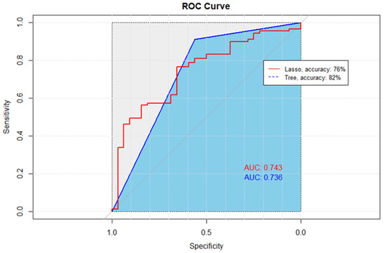 Receiver Operating Characteristic (ROC) curves comparing the performance of Lasso and CART methods. The diagonal line, representing the performance of a random classifier, serves as a baseline for comparison. The ROC curve for the Lasso method, denoted by the red line, exhibits an accuracy of 76%, while the ROC curve for the CART method, depicted in blue, achieves a higher accuracy of 82%. The ROC curves illustrate the trade-off between the True Positive Rate (sensitivity) and the False Positive Rate, with curves further away from the diagonal indicating superior performance.