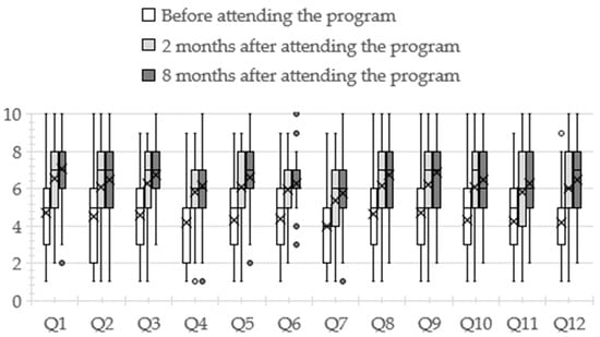 Figure 1 depicts the participants’ behavioral change scores for each question at all three time points. The questions are listed in Table 2. For all questions, scores were higher two and eight months after attending the program than before attending (p < 0.05). In addition, no significant difference was observed between two and eight months after attending the program for all questions (p = 0.504–1.000). The reliability coefficient ρ for each question ranged from 0.97 to 1.00 (Q1, 0.987; Q2, 0.996; Q3, 0.998; Q4, 0.996; Q5, 0.992; Q6, 0.988; Q7, 0.995; Q8, 1.000; Q9, 0.991; Q10, 0.991; Q11, 0.992; Q12, 0.977).