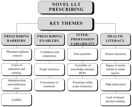There has been extensive research exploring the efficacy of novel and upcoming LLTs. Other research has investigated patient perceptions of novel agents. Within patient perception research, this has primarily focused on injectable lipid novel therapies [15,16,17,18]. To the best of our knowledge, this is one of the first qualitative studies exploring UK prescriber perceptions of all available novel lipid agents. The following discussion will examine the four identified major themes: 1. prescribing barriers; 2. prescribing enablers; 3. inter-profession variability; and 4. health literacy. This study will conclude with a Section 4.5 alongside the implications for future practice and research.