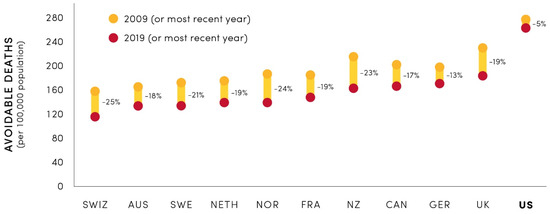 Despite the highest healthcare spending per capita, the United States (US) healthcare systems underperform compared to other high-income countries [1]. One of several performance and outcome indicators that need improvement in the US is the mortality rate [1]. As illustrated in Figure 1, the US has had a remarkably small improvement in avoidable mortality compared to 10 other high-income countries. These findings coincide with deteriorating life expectancy in the US [2,3]. According to the Centers for Disease Control and Prevention (CDC), 60% of adult Americans have at least one chronic disease [4]. In addition to the high economic burden of chronic diseases, they also are the leading causes of death, disability, and poor health in the US [4,5]. Some challenges associated with reducing chronic disease prevalence and burden are healthcare affordability, accessibility, and inequality [6,7].