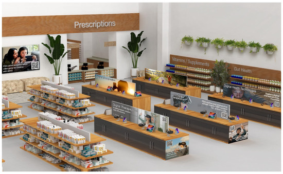 Herein, we describe opportunities to redesign aisles to offer digital health technologies to those who visit community pharmacies. As illustrated in Figure 2, such modifications to a retail space would require changing the standard layout of the pharmacy space. Digital health aisles would ideally be situated close to the pharmacy counter. The aisles containing the digital therapeutic products may be organized by disease state, similar to over-the-counter medicines. For example, a digital health aisle for diabetes would showcase products that can improve glycemic control and diabetes management, including glucose monitoring apps, insulin titration and delivery apps, nutrition and physical activity apps [110,111,112], and even therapeutic video games [113]. To optimize the consumer experience and education about these new technologies, interior design and displays can be similar to those used in consumer electronics retail shops (e.g., Best Buy and Apple Stores). Pharmacy customers could access demos and purchase consumer-grade and OTC digital health apps by scanning associated QR codes that direct them to specific websites (analogous to the affiliate marketing mechanism). Some aisles may have digital display screens or VR headsets for customers to use. Here, customers can use the headsets to experience some digital therapeutics, such as RelieVRx, and test whether or not the product is right for them. Mobile applications such as EndeavorOTC could be advertised by allowing customers to try out select games on the display screen. These interactive and entertaining displays would serve as a way to engage customers with a product they might have otherwise ignored [114].