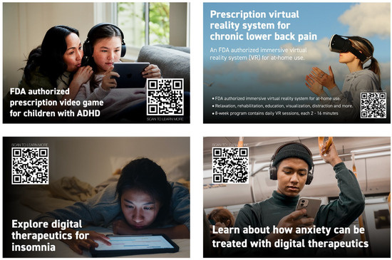 Wall posters, electronic and printed displays, and leaflets are a great way to impact consumer buying behaviors [126], as well as to educate them about the diversity and benefits of DTx and other digital health technologies. This “marketing as education” approach in retail pharmacies would likely accelerate dissemination of the related knowledge among health professionals [127,128,129]. Examples of such posters and displays are shown in Figure 3. These posters provide brief information about DTx such as EndeavorOTC for adult ADHD, RelieVRx for chronic low back pain, and Big Health apps for insomnia and anxiety.