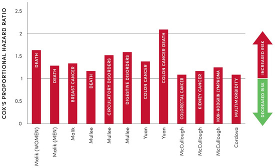 To further spotlight the relationships between the consumption of SSBs and their health-harming effects, Figure 4 illustrates data from five different studies that used Cox’s proportional hazard ratio (CHR) to investigate the impacts of drinking more than two SSBs per day when compared to the control group of drinking one SSB or less per month (see also Table S1 in the Supplementary Materials). It is apparent that higher SSB consumption increases the risks of premature death, digestive and circulatory disorders, and various cancers. This is of particular importance to the 96 million Americans who are prediabetic, 38 million Americans who live with diabetes [178], and 127 million Americans who live with CVDs [179].