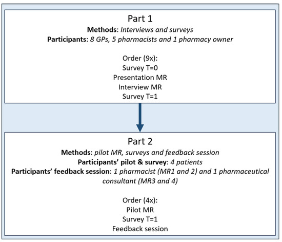 In this mixed-methods study, a term which signifies a study with qualitative and quantitative aspects, constructive and observational methodologies were combined. The reason for choosing this approach was to integrate insightful comments from healthcare providers and patients about MRs with quantitative information about PRPs. The study was conducted on the island of Aruba in May–June 2023. The study was initiated by an assembly of community pharmacies called ‘Botica di Servicio Aruba’, in collaboration with researchers from the Netherlands. Botica di Servicio is one of the chains of community pharmacy practices on the island. The study consisted of two components. In part 1, interviews and surveys were conducted with healthcare providers. In part 2, a pilot study was carried out with patients. An overview of the study’s setup is provided in Figure 1.