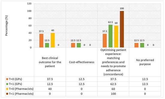 The main purposes of an MR, according to GPs and pharmacists, measured before education about MRs (T = 0) and after education about MRs (T = 1). The shares of the different answers are shown in percentages (%).