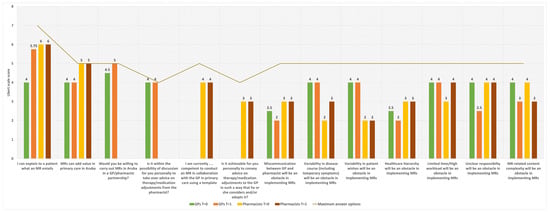 Regarding the survey, two moments of data collection from GPs and pharmacists were included in the study: T = 0 was measured before the presentation and interview about the MRs; T = 1 was measured after the presentation and interview on the MRs. The content of the survey consisted of multiple choice, open-ended, and Likert-scale questions and was the same for both data collection moments. The questions asked in the surveys were based on the studies of Elyan et al., Smith et al., and Jahangirian et al. (see Supplementary Materials, Overview S2) [18,19,20].