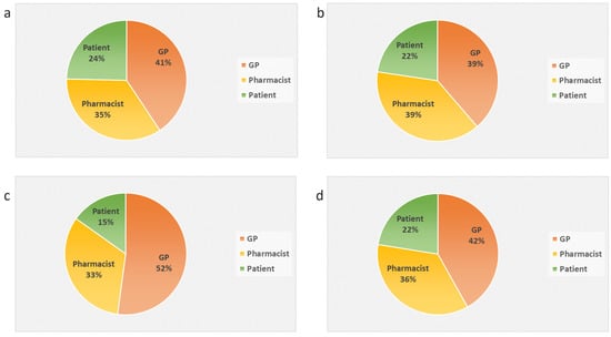 Overview of the opinions about the overall responsibility while conducting an MR. Average percentages are shown that reflect the degree of responsibility of the GP, pharmacist, and patient in an MR, as described by the participating pharmacists and GPs. (a) Opinions of the pharmacists before the education about MRs (T = 0). (b) Opinions of the pharmacists after the education about MRs (T = 1). (c) Opinions of the GPs before the education about MRs (T = 0). (d) Opinions of the GPs after the education about MRs (T = 1).
