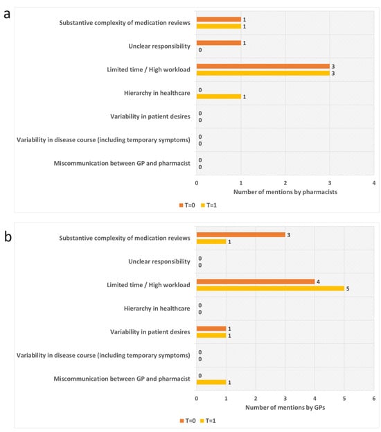 Description of main impediments in conducting MRs, according to the participating GPs and pharmacists. Each GP and pharmacist was only allowed to indicate the one impediment which they considered most relevant. (a) Opinions of the pharmacists before education about MRs (T = 0) and immediately after education (T = 1). (b) Opinions of the GPs before education about MRs (T = 0) and immediately after education (T = 1).
