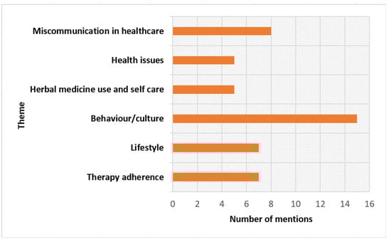 According to their experiences, GPs, pharmacists, and the pharmacy owner talked about various themes that could influence an MR or could play a role during an MR in Aruba. The number of times these themes were mentioned by healthcare providers is shown in Figure 6. The most frequently mentioned themes were related to behaviour/culture, miscommunication in healthcare, lifestyle, and therapy adherence. The other topics mentioned were health issues, such as excessive NSAID use, addiction to sleep medication, and under-treatment, in addition to the extensive use of herbal products. In the area of behaviour/culture, healthcare providers argued that there are particular differences between the Latin American and Dutch cultures in the field of healthcare, which might imply that MRs with patients from different cultures require different approaches. Furthermore, the healthcare providers mentioned therapy adherence as a significant theme, which points specifically to non-adherence. According to healthcare providers, possible causes of non-adherence relate to a low level of education, shame, multilingualism, intellectual disability, and limited health literacy. Regarding lifestyle, we noted that diabetes, being overweight, and obesity are highly prevalent in Aruba.