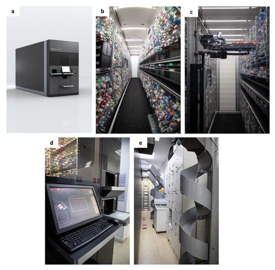 Robotic dispensing solution implemented. (a) Outside view of the automated storage and dispensing robot; (b) packages organized on shelves inside the robot; (c) picking head moving multiple packages; (d) touch-screen user interface and input belts; and (e) conveyor system with spiral chutes to transport packages from the upper floor to the ground floor.