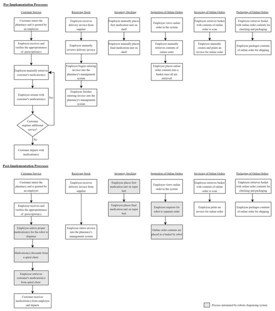 This prospective, single site, pre- and post-observational quality improvement (QI) study was designed to assess the impact of a robotic dispensing system on pharmacy workflows and the process times associated with each. Using observational techniques, the time required to perform relevant pharmacy activities was measured onsite by an external observer (from a third-party vendor not affiliated with the study site or study sponsor) before and after the installation of a robotic dispensing system. During both the pre- and post-implementation phases, the pharmacy staff consisted of a pharmacist, a technician, and three employees dedicated to inventory and stocking all performing activities that are expected in one’s job description. The pre-implementation visits took place in November 2021, and post-implementation visits occurred in August 2022. Each visit measured one specific pharmacy workflow. No changes to standards of care were implemented. No customers were involved in responding to questions or asked to perform any different tasks as part of this project. No customer or staff member information was collected or could be identified, directly or through identifiers.