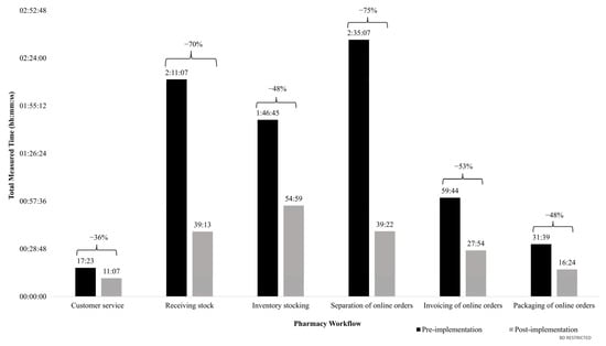Figure 3 displays the total time of all recorded measurements in each pharmacy workflow before and after the installation of the robotic system. A decrease in the total process time was observed across all workflows, but the most notable reductions were noted for activities related to receiving stock (−70%) and separation of online orders (−75%).