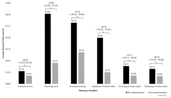 The difference in average measured time per workflow (min:ss) between the pre- and post-implementation periods, along with their 95% confidence intervals, are displayed above the brackets for each pharmacy workflow.
