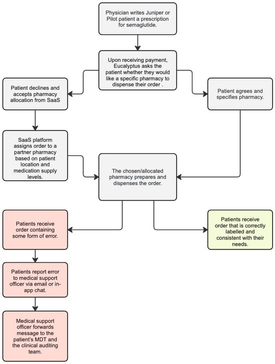 All Juniper and Pilot patients are clearly instructed to inform their medical support officer via email or the programme’s in-app chat feature if the pharmacy makes any form of error (e.g., if they have distributed the wrong medication or labelled the order incorrectly). Reported errors are forwarded by medical support officers to the patient’s MDT, who consults the patient on the appropriate course of action. All error-related communications between patient, medical support staff, and clinicians are also forwarded to the Eucalyptus clinical auditing team, who store pharmacy error data in Jira software (version 9.14.x), including characterisation of the error type and urgency. Throughout the study period, semaglutide was the only GLP-1 RA medication prescribed to Eucalyptus Australia DWLS patients. All patients received 4 semaglutide syringes per order. The exact same dispensing and error reporting processes were used in the Juniper and Pilot DWLSs. A flow chart of the semaglutide dispensing process can be viewed in Figure 1.