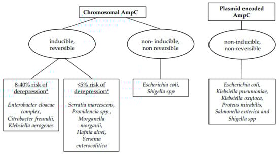 Classification of AmpC enzymes produced by Enterobacterales. * During antibiotic treatment with beta-lactams (each beta-lactam is associated with a different risk of derepression).