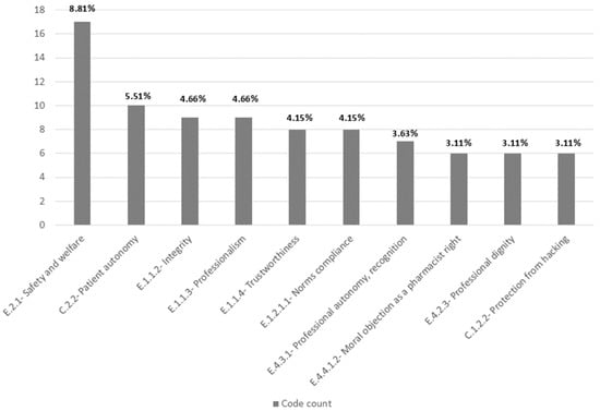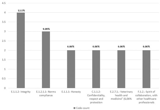 In total, 53 codes were identified, summing 193 code counts, including repetitions. This code of ethics was the most extensive, with 57 articles and over 5000 words. Figure 2 illustrates the frequency of the most applied codes in the Portuguese code of ethics.