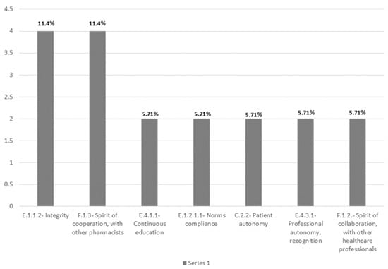Analysing the code frequency for FIP codes, the following codes were not present: “C.1.1.3—Confidentiality, compliance with the law”, “C.1.1.4—Confidentiality, informed consent”, “E.2.3—Equity”, “E.2.4—Justice”, “E.2.5—Resource managing”, “E.4.3.2—Managing loyalties”, and “F.1.1—Spirit of collaboration, with healthcare industries”. This means that from the 24 FIP codes, 17 were identified.