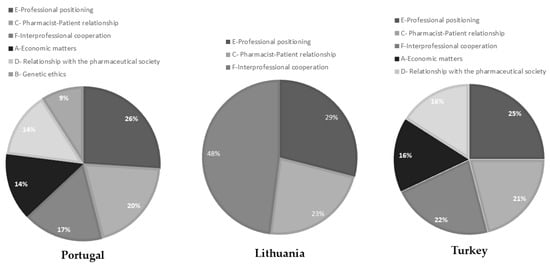 Essential ethical values run through all the ethical documents analysed, regardless of cultural background and specific deontological practices, such as honesty, integrity, professional autonomy, and patient safety and welfare, aligning with high-hierarchical ethical principles. Unique ethical issues and priorities were also found, such as the importance of patient confidentiality and the protection of the pharmacist’s professional role in Portugal. In Turkey, on the other hand, the dependence on physicians and the protection of animals is a significant theme. Even with the main themes, the countries show different priorities. While “E—Professional positioning” was frequently used in the Portuguese and Turkish codes, the Lithuanian code underlined the theme “F—Interprofessional collaboration”. This demonstrates the natural need to adjust each code to the main concerns and needs of the situated professions it serves.