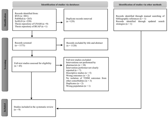 Studies were considered for inclusion if they quantified the effects of PIs delivered in Mexico via any route and in any setting directly to adult patients with T2DM or to healthcare professionals caring for these patients who measured the effects of PIs on glycosylated hemoglobin (HbA1c) and fasting blood glucose (FBG) levels as primary endpoints and the following secondary endpoints: lipid profiles, systolic and diastolic blood pressure, weight loss, urine albumin/creatinine ratios, risks of coronary heart disease, risks of stroke, self-care activities such as diet and exercise, cost-effectiveness ratios (quality-adjusted life years (QALYs)), hospitalizations, morbidity, mortality, drug-related problems, negative outcomes associated with medication (NOMs), adverse drug reactions, health-related quality of life, therapeutic adherence, level of knowledge and patient satisfaction. All studies for which the full text could not be accessed, secondary studies such as systematic reviews and meta-analyses, descriptive studies, studies where nonclinical pharmaceutical activities were performed (storage, dispensing, etc.) or those in which activities were not performed by a pharmacist, were excluded from the systematic review.