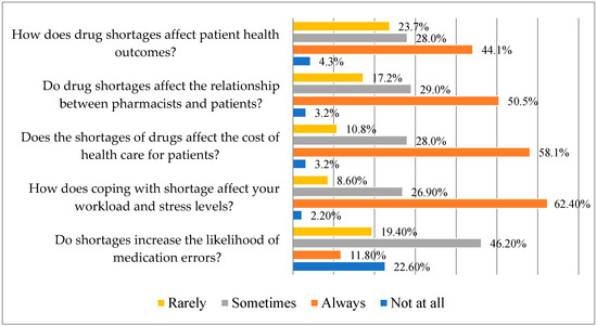 According to several pharmacists who answered, there is occasionally a higher chance of drug errors due to shortages (46.2%). According to 62.4% of pharmacists surveyed, shortages always have an impact on workload and stress levels, and they also have an impact on patient costs of healthcare (58.1%). Over 50% of the participants agree that shortages of medications always affect patients’ interactions with pharmacists and have an effect on patients’ health outcomes (Figure 3).