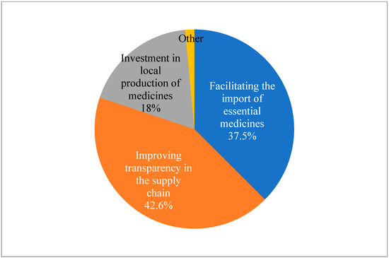 To improve preparation and reaction, respondents demanded that drug inventory levels and shortage projections should be regularly published. Enhancing import procedures was another way to highlight the need for better infrastructure to enable quicker and more dependable importation, and 38% of respondents suggested streamlining the import procedure for necessary medications, which includes assisting and enhancing cooperation between regulatory bodies. Reinforcing local production was the least chosen choice as a recommendation, but merely 18% advocated for investment in local pharmaceutical manufacturing, emphasizing that this is not a favorite strategy (Figure 4).