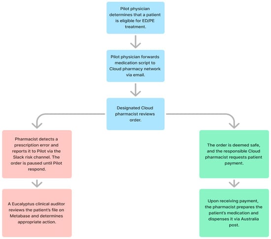 If pharmacists suspect an error has been made on a Pilot patient prescription, they raise their concern via a dedicated risk channel on Slack, San Francisco, Cal, USA—a cloud-based team communication platform with instant media sharing and voice and video call functionalities. Whenever pharmacists raise a concern, an alert is automatically sent to the Eucalyptus clinical auditing team (all qualified pharmacists or nurses), who then contact the patient’s prescriber. In cases they consider more serious, auditors will immediately set up a new consultation between the patient and their doctor. Cloud pharmacists cannot contact Pilot patients while a prescription is under review; however, they are free to provide counselling recommendations to Eucalyptus auditors, which they often include in their initial Slack message. If an identified error is resolved, the pharmacist will perform a final check of the medication, request patient payment, and dispense the order. Pharmacists are free to provide patients with their own relevant counselling via phone or SMS after orders are dispensed. Cloud pharmacy’s role in the Pilot sexual dysfunction service is displayed in Figure 1.