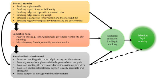 Survey questions were developed based on the Theory of Planned Behavior (TPB), predicting individuals’ intention to engage in behavior within a specific context. In the context of facilitating tobacco cessation care with pharmacists, TPB suggests that favorable attitudes towards quitting, social norms endorsing cessation, and perceived behavioral control are associated with greater intention to quit [15,16]. These constructs guided the development of survey items, ensuring alignment with key factors influencing smoking cessation intention (Figure 1) [15,16].
