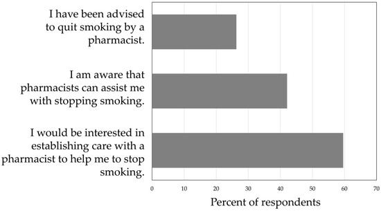 Fewer than half of the patients were aware that pharmacists could assist with quitting, and more than half reported that they would be interested in establishing care with a pharmacist for stopping smoking (Figure 2). Among those who were interested (59.6%), 60.6% perceived it to be more convenient to establish care with a community pharmacist, and 38.9% agreed it would be more convenient to have appointments held online via telehealth (22.2% did not agree, and 38.9% had no preference). Half of current tobacco/vaping users intended to ask their pharmacist for help with quitting, and 35.2% intended to ask their pharmacist about the benefits and risks of smoking cessation medication use for their quit attempt. Six (11.1%) were interested in group sessions with a pharmacist and other tobacco users. Most (61.1%) believed that people important to them would be supportive of their receiving aid from a pharmacist to quit (7.4% disagreed; 31.5% were unsure).