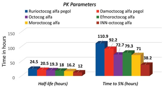 Concerning the pharmacokinetic properties of factor FVIII concentrates, rurioctocog alfa pegol demonstrated the longest half-life at 24.5 h, followed by damoctocog alfa pegol at 20.5 h, octocog alfa at 19.3 h, efmoroctocog alfa at 18 h, moroctocog alfa at 16.2 h, and INN-octocog alfa at 12 h. In terms of the average time required to reach 5% of FVIII levels, INN-octocog alfa had the shortest duration at 38.2 h, with moroctocog alfa at 71 h, octocog alfa at 72.7 h, efmoroctocog alfa at 79.3 h, damoctocog alfa pegol at 92.2 h, and rurioctocog alfa pegol at 110.9 h following (Figure 1).