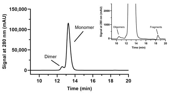 SE-HPLC elution profile of dimeric and monomeric pembrolizumab. Oligomers and fragments are magnified in inset.