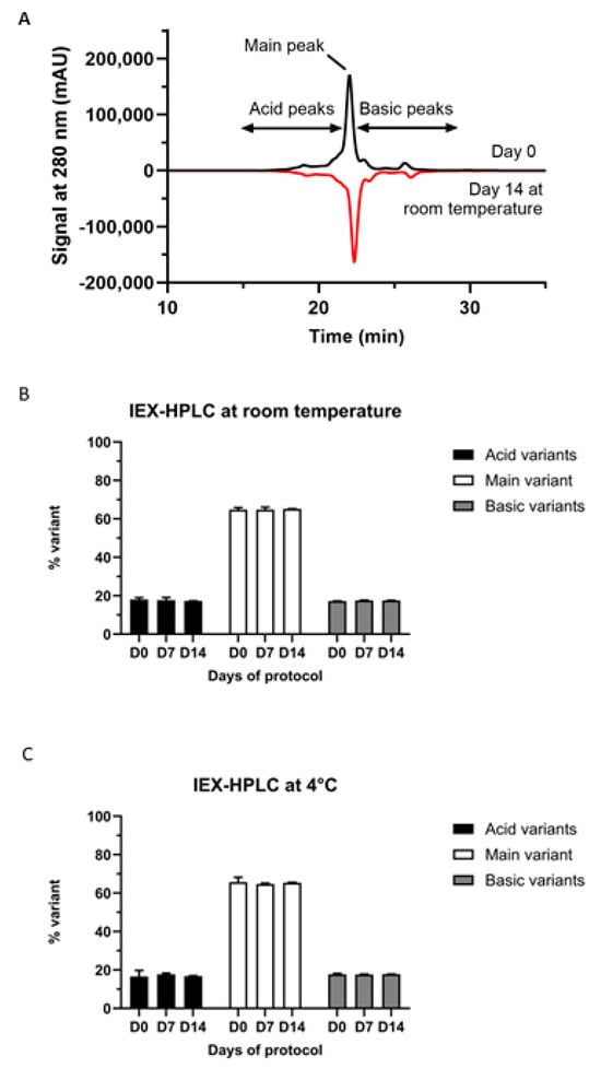 (A) IEX-HPLC elution profile of pembrolizumab. A number of peaks of the respective isoforms of pembrolizumab (main, acid and basic) are represented by the black tracing, with Day zero respective proportions. The same data are shown on Day fourteen at RT by the tracing in red. (B) Respective percentage of pembrolizumab’s same isoforms at Days zero, seven and fourteen with storage at RT. (C) The same data as in panel B but with vials stored at 4 °C.
