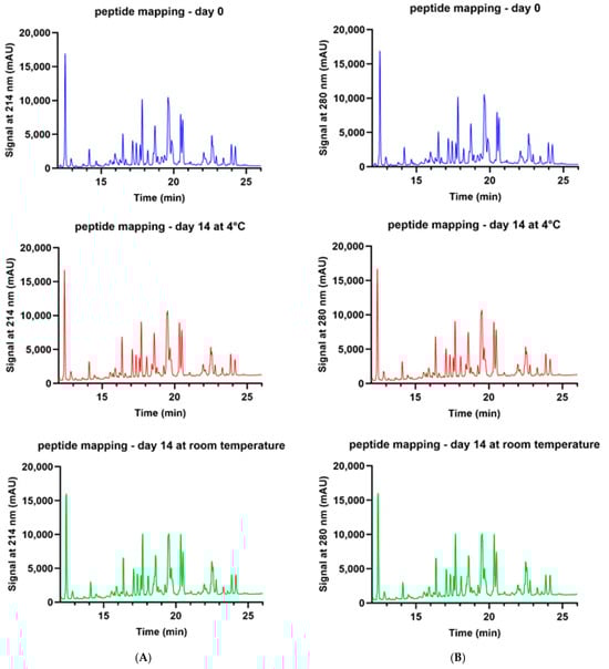 Chromatograms generated in peptide mapping experiments (Figure 3A,B) revealed that at two different wavelengths (214 and 280 nm), pembrolizumab’s primary structure was not affected at all when vial leftovers were stored for as long as 2 weeks at either room temperature or at 4 °C. Indeed, all pembrolizumab chromatograms obtained at either 214 or 280 nm are nearly superimposable.