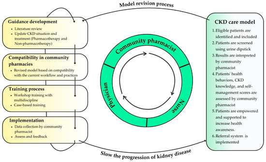 Following the implementation of the model, the researchers convened a focus group meeting with pharmacists to reflect on the operational guidelines. The discussion covered the implementation of guidelines, tools used, problems encountered, factors influencing feasibility, practical and non-practical activities, and reasons for non-adherence to the plan. The goal of the meeting was to reach a consensus on how to improve the CKD screening program and develop a reusable care model. Model components and interventions were established based on the inputs and objectives of the stakeholders, and are shown in Figure 1 and Table 1.