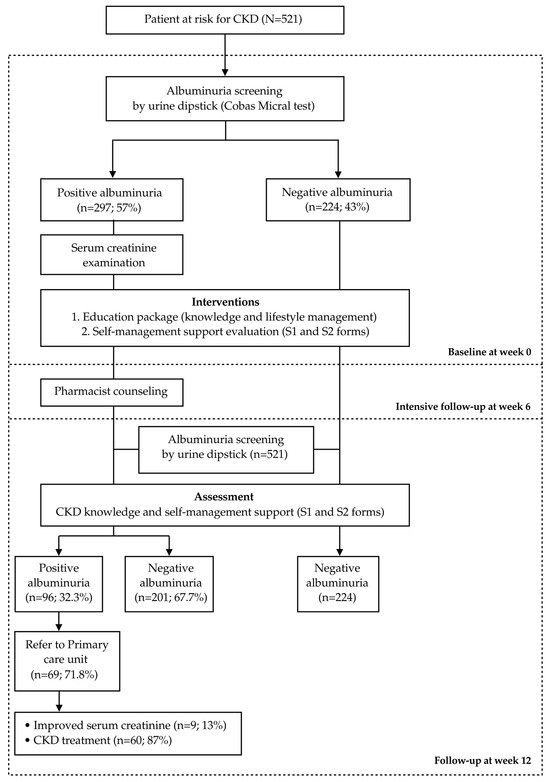 This study has several limitations. First, the researchers did not analyze the quality of life of the participants in the screening; therefore, the researchers could not evaluate the relationship of the self-management system to kidney filtration rates and quality of life as part of the study [40]. However, this study found that some topics related to SMS involve avoiding drugs or herbs that affect the kidneys, and non-smoking contributes to a decrease in urine protein levels. Second, this study was conducted in community pharmacies and screened by pharmacists; therefore, we had restrictions on blood sampling, resulting in the need to transfer participants for serum creatinine testing. For further research, screening participants’ blood samples should be arranged in cooperation with network medical or laboratory technicians. Third, the collection of urine samples depended on the participants’ convenience, being affected by the time of day. This may interfere with the results of this study.