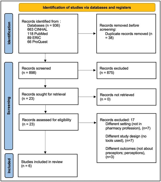 A narrative description of the included articles was summarized in tables to present the collected data. Out of 936 articles retrieved from databases, 38 were duplicates and were hence removed (Figure 1). After the title and abstract screening of 898 articles, 23 articles were eligible to be included in the full-text screening. The main reasons for exclusion were a different setting (i.e., the studies were not in pharmacy colleges or pharmacy training sites like hospitals and community pharmacies), a different study design which did not include a tool/survey for data collection (e.g., the Delphi method or qualitative designs that included interviews or focus groups), and different outcomes (i.e., studies that did not investigate perceptions and focused on other outcomes such as performance or satisfaction). A total of six articles qualified for inclusion into the full screening and were used to inform the results of this scoping review.