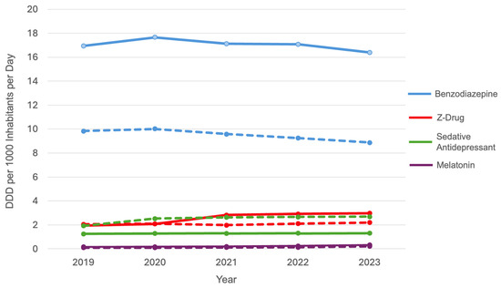 Trends in sedative psychotropic drug use in Italy and South Tyrol (2019–2023). Solid lines represent Italy, and dashed lines represent South Tyrol. DDD, defined daily dose.